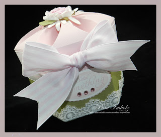 Ok - before I get too tearful - here's my favorite template - in my favorite colors - all set to hold a special little "gem" of a gift *tee hee* This is a template from MyTimeMadeEasy and is probably my all time favorite gift box - I've re-created this little box so many times in so many ways but I went back to my original design for this one today. Pink and green and lace and flowers --- my idea of feminine.