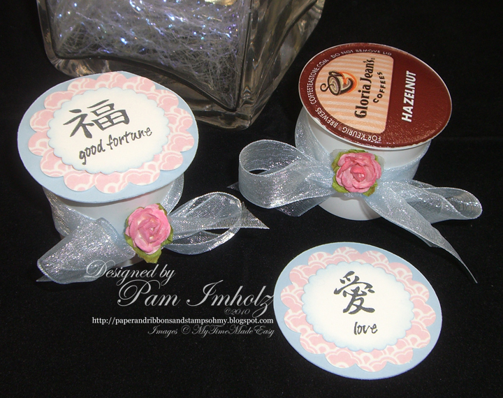 This is one BEAUTIFUL set Pam. I love the soft colors you used and that cherry blossom paper looks fabulous! Love how you decorated the individual K cups with the different sentiments...you are so clever! Oh and the card is adorable inside and out! LOL! Happy New Year!